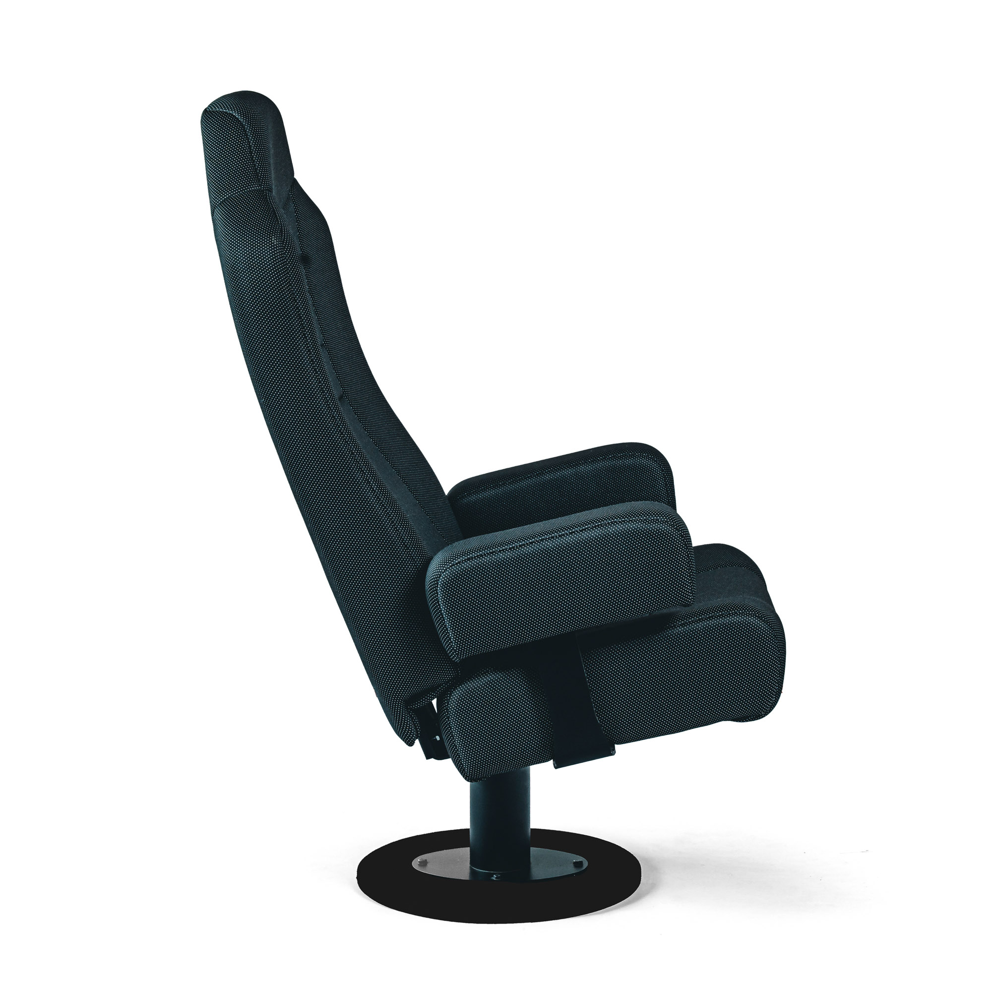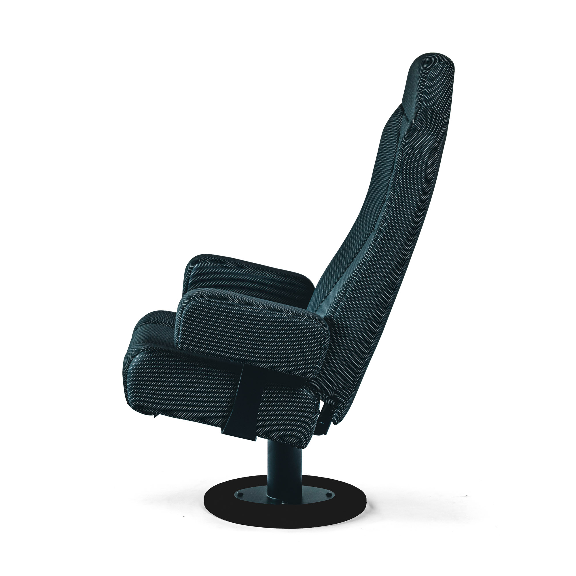 Konstrukce křesla PEGAS vychází z ocelového nosného rámu na centrální nebo dvojité noze, doplněného o dřevěnou kostru, která zvyšuje pevnost a stabilitu křesla i při každodenním provozu. Ergonomicky tvarovaný sedák a čalouněný opěrák jsou vyplněny studenou pěnou s vysokou hustotou, takže si křeslo dlouhodobě drží tvar a poskytuje pohodlné sezení i při delší projekci.